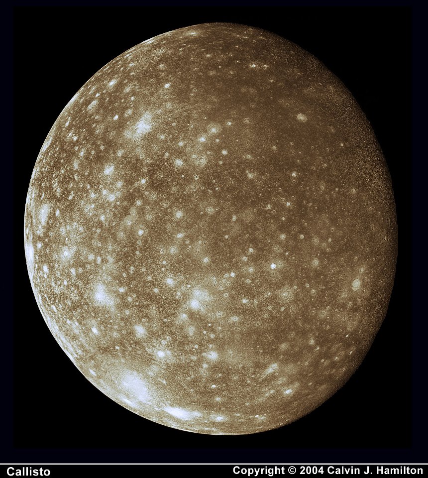 Callisto is the fourth and final of the Galilean satellites. (We hope you enjoyed our tour of the four Galilean moons of Jupiter!) Callisto is nearly the same size as Mercury by diameter, but with only about a third of the mass. This makes the final Galilean moon the thirteenth largest object and third largest moon in the solar system (by both diameter and mass). Callisto is the eighth closest moon to Jupiter and, of the Galilean satellites, is the furthest one out. In fact, Callisto orbits so far away from its host that it’s possible to see the moon without a telescope. To achieve that feat, you need very good eyesight and Callisto needs to be near its aphelion – it also helps to block out Jupiter’s light with a small object.