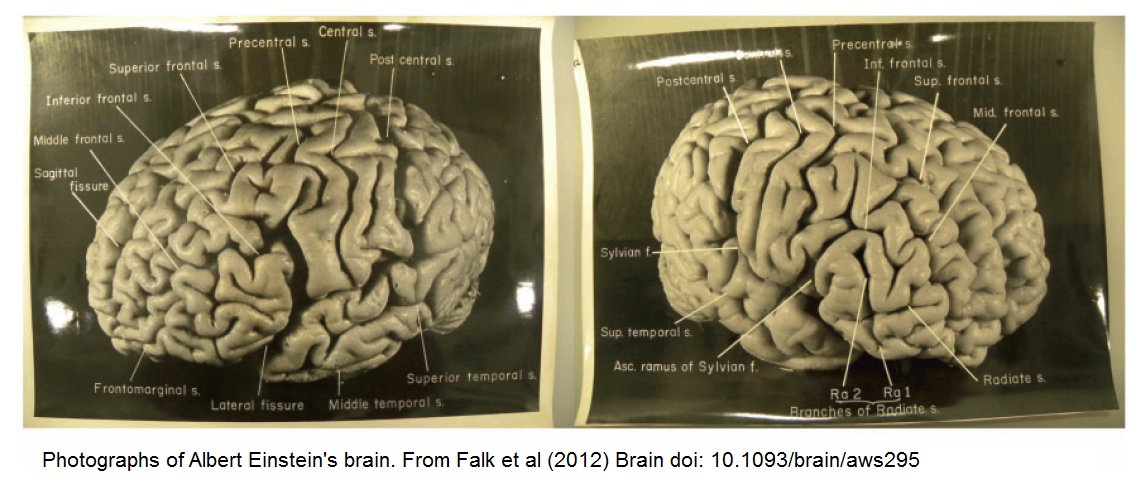 Hines goes a little further to say that there is a post hoc logical fallacy used by those who attempt to explain Einstein’s intelligence by looking at his brain’s structure. The smallest abnormality tends to get blown up and serves as an example of confirmation bias since researchers are looking for a reason for Einstein’s brain to be special.