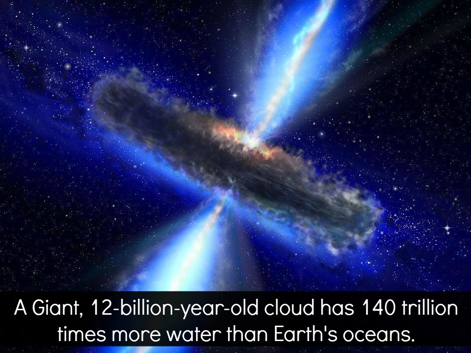 The black hole in question is approximately 20 billion times more massive than the Sun and it produces as much energy as 1 quadrillion suns. The cloud that orbits this beast was found to be harboring 140 trillion times more water than all of Earth’s oceans combined. That’s enough water to give each person alive today an entire planet’s worth of water 20,000 times over (that’s a lot of water). Not impressive enough, the cloud alone contains 4,000 times more water vapor than what it estimated to exist in the Milky Way galaxy. Of course, the key here is water *vapor* as much of the Milky Way’s water is locked up in ice (see: Europa).