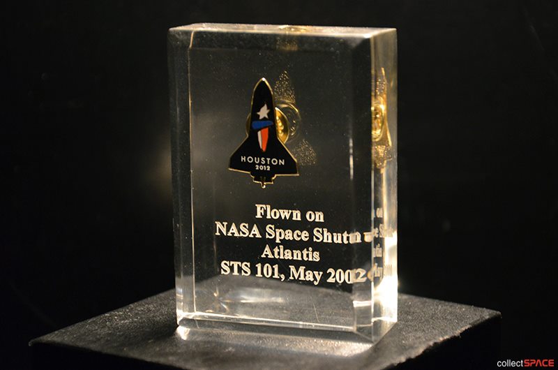 On this particular flight, the OFK contained a thousand lapel pins from the Houston 2012 Foundation. The pins (one is pictured here) are in the shape of the space shuttle, engraved with the stylized Texas flag unique to the Huston Foundation and the words “Houston 2012”. These pins traveled a distance of 4.1 million miles while on board Atlantis and eventually circled the Earth 155 times. Upon returning to the ground, most of the pins were put into these acrylic cases, which simply read, “Flown on NASA Space Shuttle Atlantis STS 101, May 2000”.