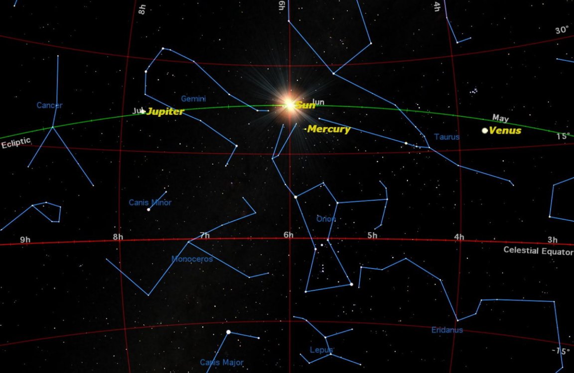 In the summer solstice sky map (which is pictured above) the celestial equator is marked in red. The numbers mark hours of right ascension (this is the celestial equivalent of longitude on the Earth’s surface). The green line marks the path that the Sun will travel across the celestial sphere.