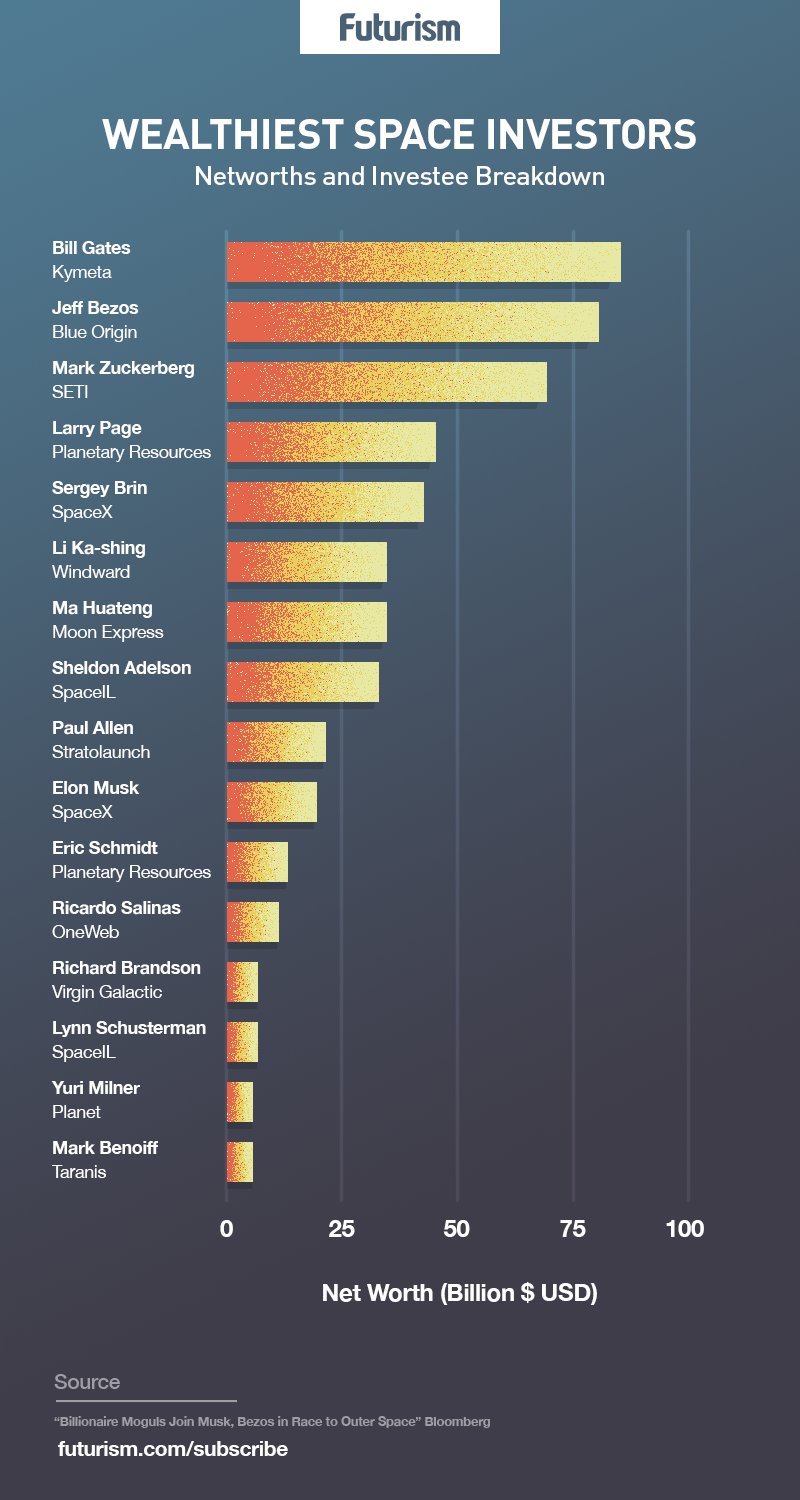 Together these individuals share a net worth of $513 billion, and every dollar could be used towards these ventures given the wildly expensive production, development, and innovation currently underway. Already, Richard Branson’s Virgin Galactic has invested more than $600 million to boost commercial flights into suborbital space before the end of 2018. Additionally, Casino magnate Sheldon Adelson is funding a lunar mission, and banking and retail billionaire Ricardo Salinas has invested in the OneWeb satellite network.
