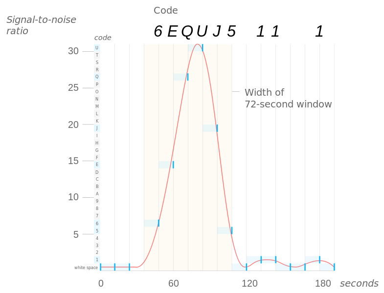 The signal has the code 6EQUJ5. A blank space on the print out has an intensity between 0 and 1. After that, 1-9 have intensities corresponding to the number (so a 2 has an intensity of 2.0). A-Z pick up where 9 left off (so, A has an intensity of 10.0, B of 11.0, and so on).