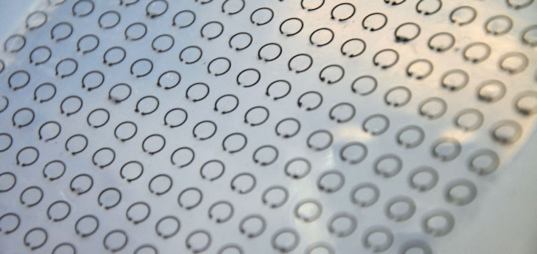 The material is comprised of tech that is embedded in a flexible sheet of silicon. Each ring is filled with liquid metal galinstan that covers the entire surface of the material, working as electrical inductors, while the gaps in between them act as capacitors.