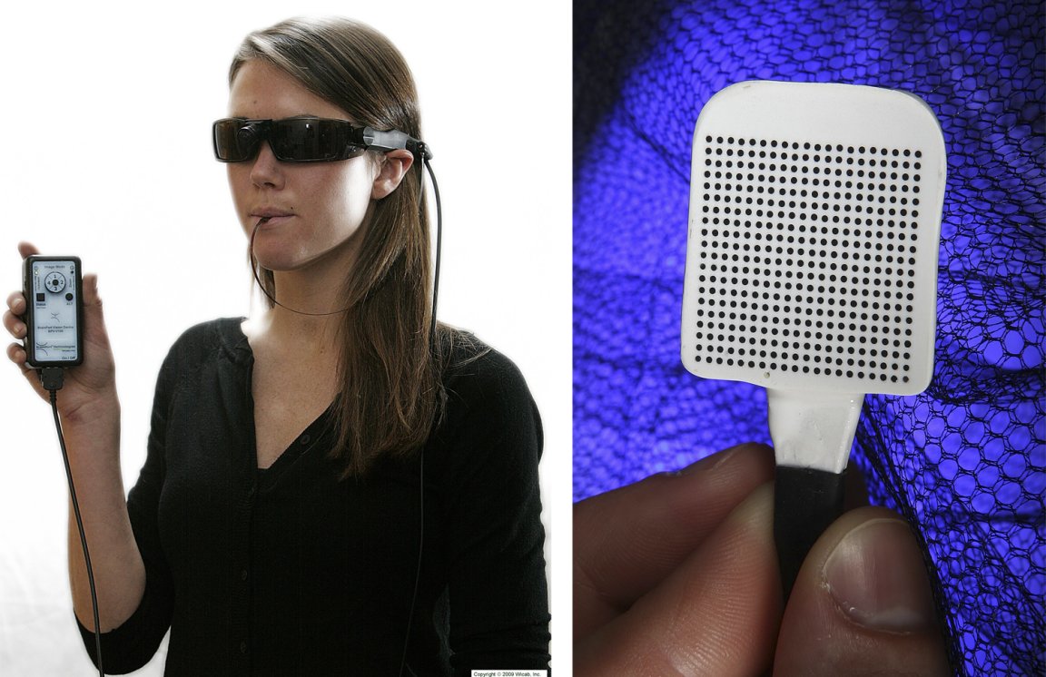 BrainPort includes component that is placed in the mouth and uses a video camera to essentially draw maps on the tongue. With practice and learning, the brain is able to conceptualize visual representations from the sensory information received on the tongue.