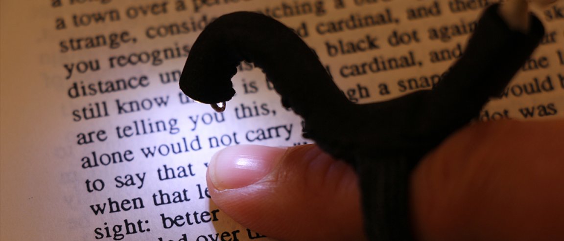 The tiny camera can be clasped onto the finger, like a ring, while the rest of the device grips the wrist. As the wearer moves their finger along a line of text, the camera picks up the text and a computer reads it aloud. Audio cues and gentle vibrations from the device guide the user between lines or let them know when they need to adjust the position of their finger.