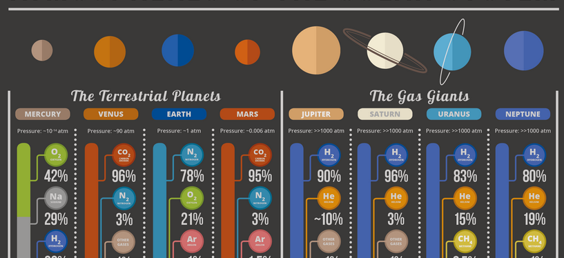 We are all familiar with the various elements that make up our own little world. Of course, there is the air that we breath and need to survive, which is made up of about 78% nitrogen, 21% oxygen, and a small amount of other elements (yes, there is more nitrogen than oxygen in the air). Then, of course, our planet itself has a relative abundance of water. Earth’s oceans cover much of the planet, making up some 70% of the Earth’s surface, and as a fun aside, our waters have an average depth of 2.5 miles (4 kilometers). We also have the rocky material, which is made up of iron, oxygen, silicone, and trace amounts of other elements. But what about the other planets in our solar system? What are they made of?
