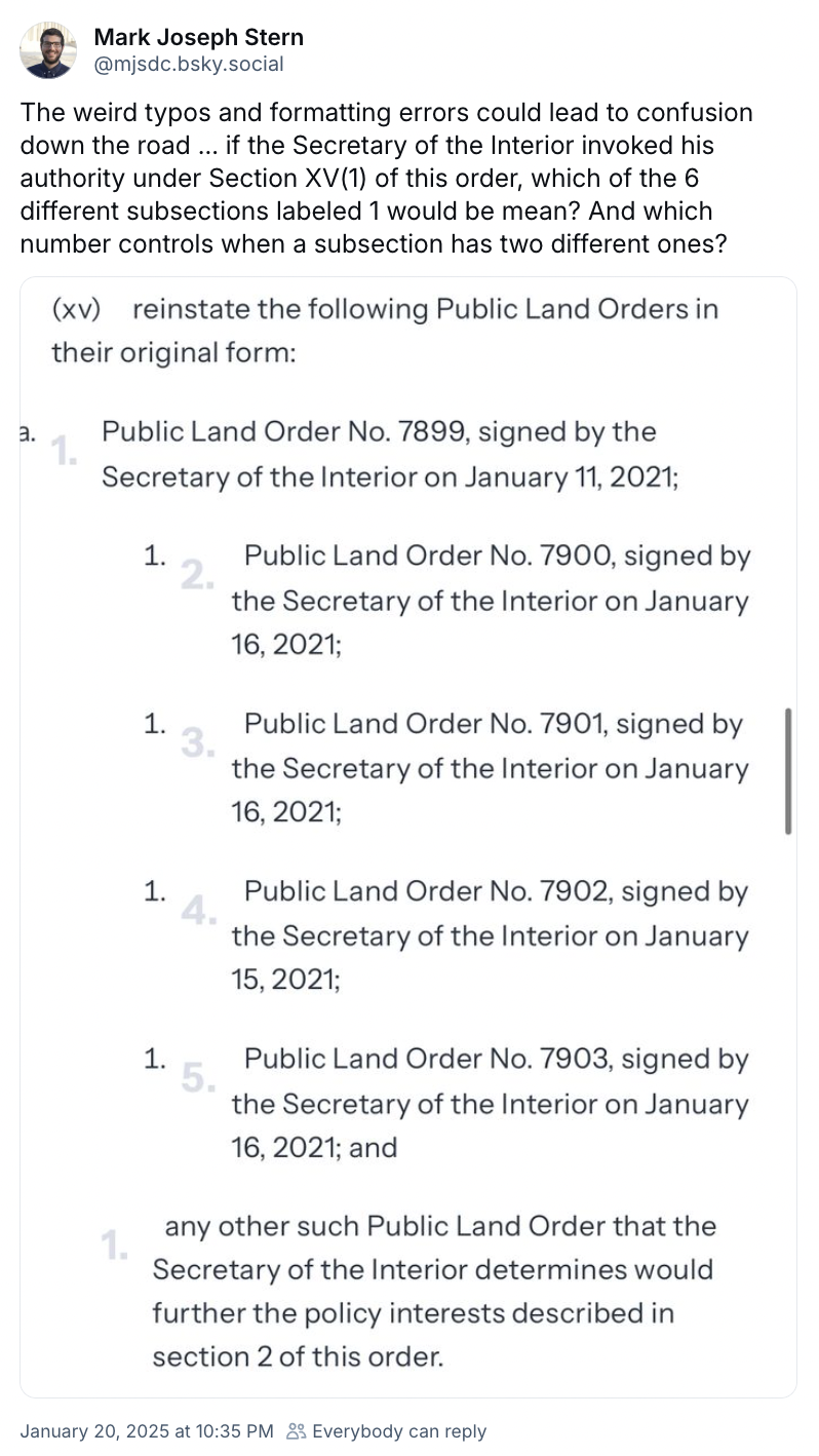 “The weird typos and formatting errors could lead to confusion down the road,” Stern wrote of the bungled numbered list. “If the Secretary of the Interior invoked his authority under Section XV(1) of this order, which of the 6 different subsections labeled 1 would [he] mean? And which number controls when a subsection has two different ones?”