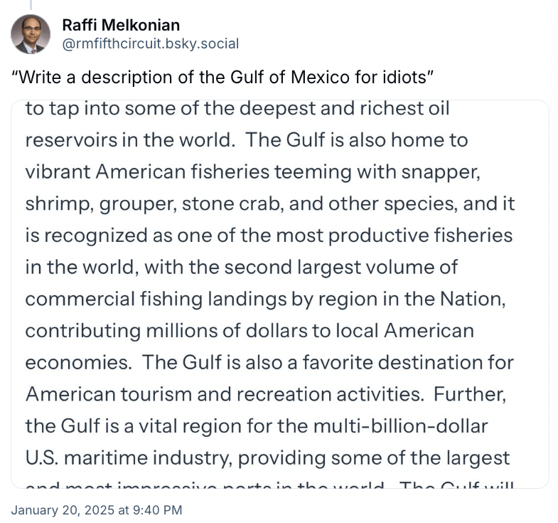In another post to Bluesky yesterday, the Houston-based appellate lawyer Raffi Melkonian called attention to a section of another new executive order — titled “Restoring Names That Honor American Greatness” — that declares a rebrand of the Gulf of Mexico as the Gulf of America.