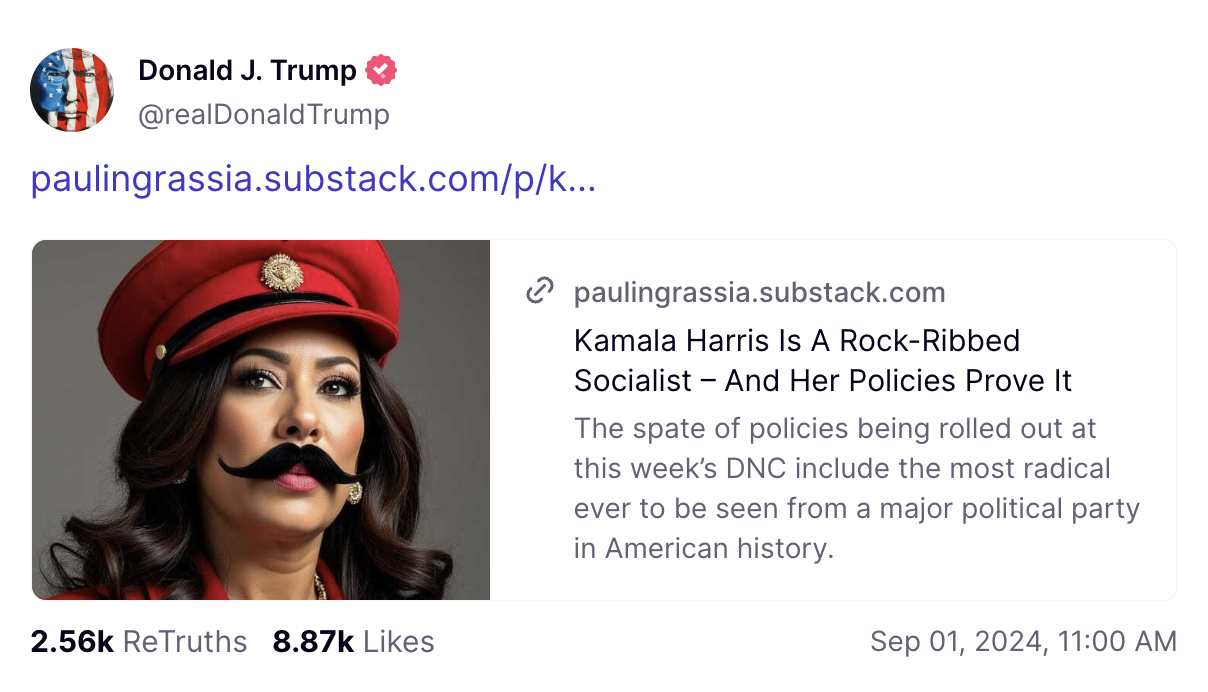 The image was taken from a Substack post by a writer who works at the Gateway Pundit, a far-right digital publisher notorious for publishing stories promoting baseless allegations that the 2020 election was stolen from Trump (copious evidence, and many judges he appointed, have found those claims to be false.) Trump reposted the image and a link to the Substack post — which described Harris as a “rock-ribbed socialist” — without comment.