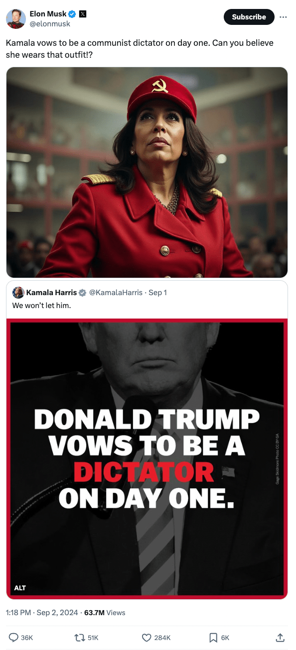 Trump wasn’t the only far-right figure to employ AI this weekend to further communist allegations against Harris. On Monday, in response to an X post from the Harris campaign that referenced Trump’s vow to be dictator on “day one” of his second term, X owner Musk used the platform he bought in 2022 to share his own AI image of Harris decked out in communist garb.