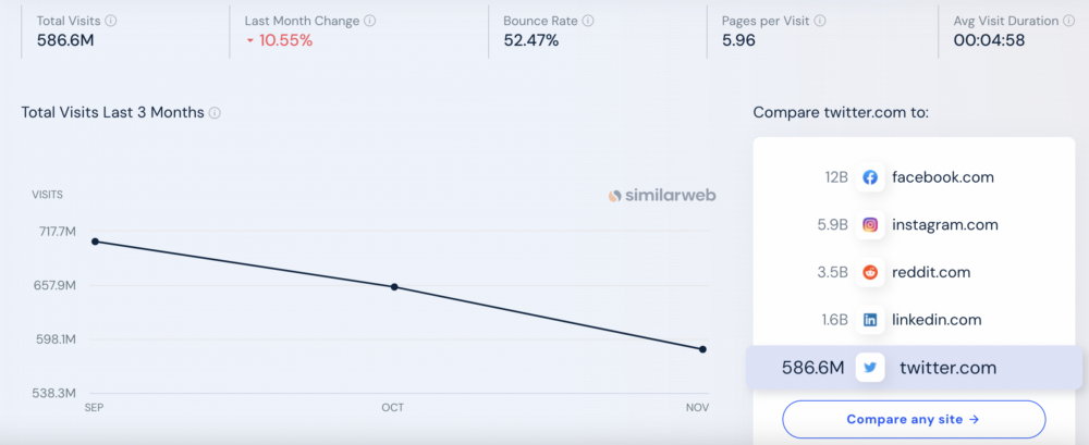 As the data shows, global traffic to Twitter.com has fallen from roughly 706 million visits in September to just 586.6 million by November — a 10.5 percent drop in the past month alone.