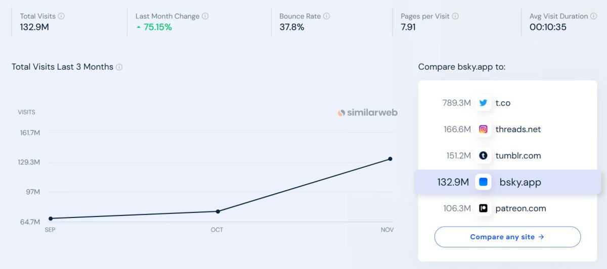 Similarweb data also suggests that while Twitter’s traffic has fallen, it’s skyrocketed on Bluesky, likely reflecting many of the same users switching services. Notably, there was no falloff after October — in fact, visits instead jumped by a large margin.