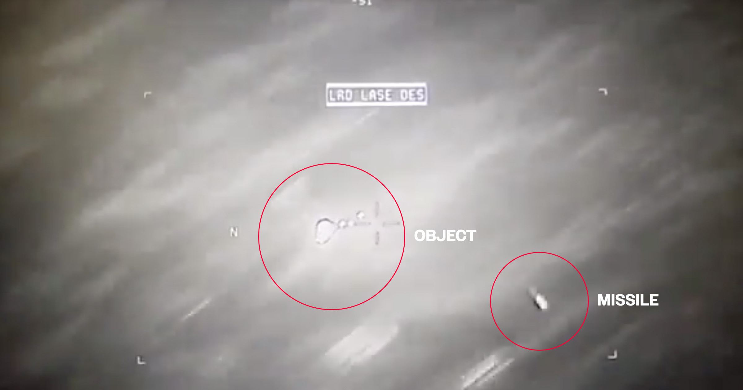 The strange object took the hit and was momentarily pushed off its trajectory by the missile, which also appeared to cause some debris to eject from it, before correcting course. It’s unclear from the video, which zoomed out just after the strike, where the debris went.