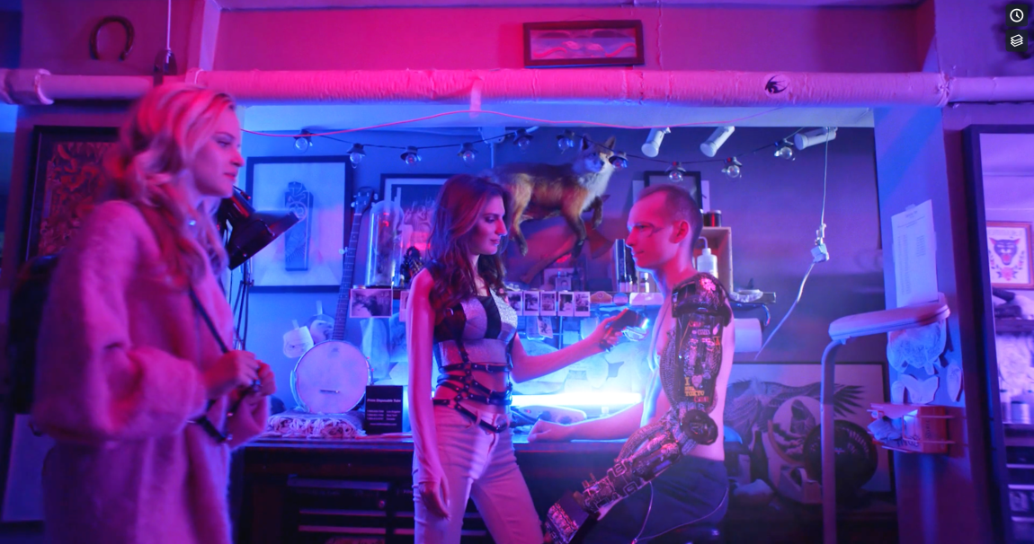 Another important technique associated with VFX is motion tracking. A point is usually marked during filming that will have to be automatically or manually tracked within editing software for the removal of the element or attachment of effects. For example, the biomodification, or cyborgism, seen throughout Glimpse’s Circuits involves tracking the actors’ body parts in post for tattoo attachment points.
