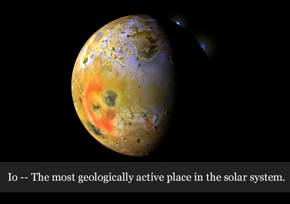 If there was a contest for the most un-Earth like world, Io would be one of the top contenders. Without a doubt, the most interesting thing about Io is its huge quantity of active volcanoes. As you can see, this volcanism makes the moon look more like a large ball of cheese (or a terribly unappealing pizza) than an actual world.