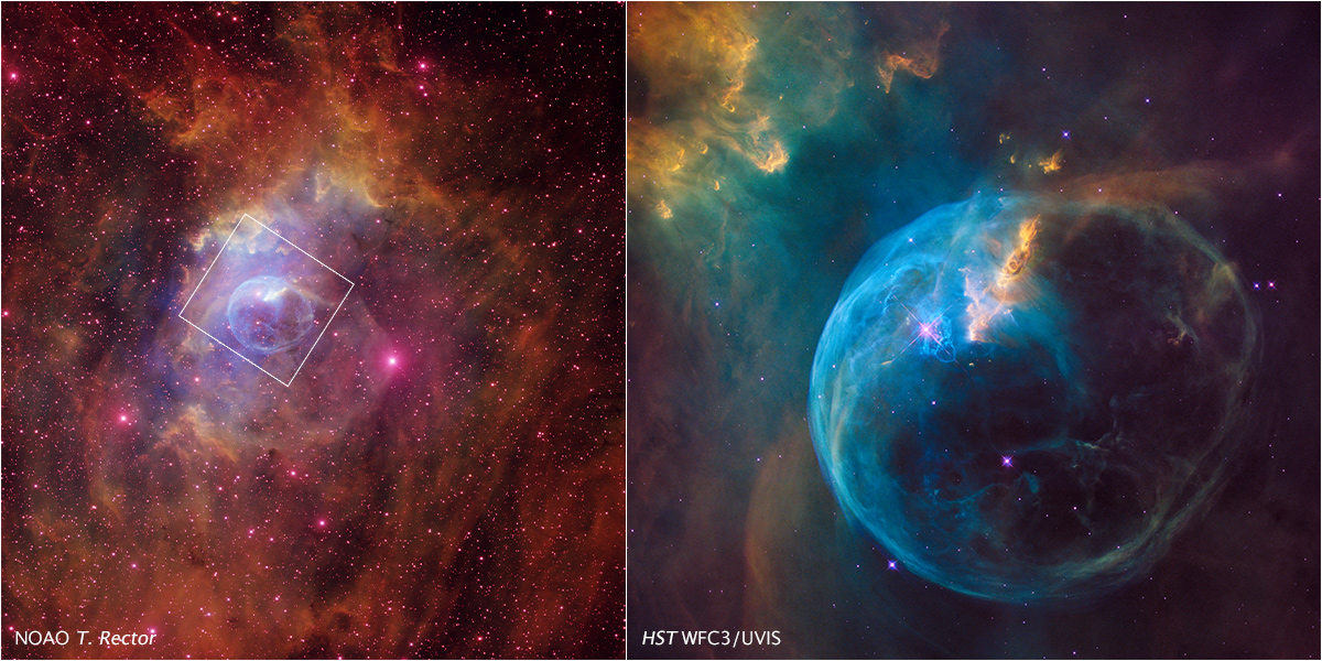 To commemorate the recent anniversary, astronaut and associate administrator of NASA’s Science Mission Directorate, John Grunsfeld, stated that the image captures what Hubble is all about: “As Hubble makes its 26th revolution around our home star, the Sun, we celebrate the event with a spectacular image of a dynamic and exciting interaction of a young star with its environment….the view of the Bubble Nebula, crafted from Wide Field Camera 3 images, reminds us that Hubble gives us a front-row seat to the awe-inspiring universe we live in.”
