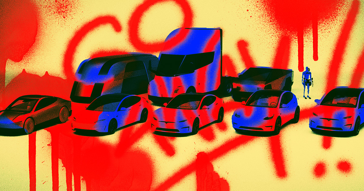 The phenomenon is also strikingly international, mirroring Tesla’s plummeting global sales. Earlier this month, a Tesla showroom in the Hague was vandalized with anti-Nazi imagery and messages. A group of activists in Germany, meanwhile, projected the word “Heil” along with Musk’s Nazi salute on the exterior of Tesla’s Berlin gigafactory.