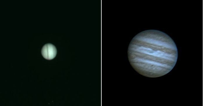 The image on the left was taken with my DSLR (not a webcam) and then HEAVILY cropped. As an image it’s not half bad, the bands of Jupiter are clearly visible, but the image is lacking any detail within the clouds. The reason there isn’t any detail goes further than the camera resolution (although it does play a part, I don’t think I used my 4x barlow when taking this image). For example, turbulence within the atmosphere makes it impossible to take a crystal clear single shot image. As the photons travel through our atmosphere, they pass through thermal currents and get slightly bent and refracted, all of these aspects make it more difficult to get a clear image. Combining many hundreds or even thousands of images works to cancel out this problem. The simple fact is, a large format CCD imager will never be able to take enough images in the short period of time before Jupiter’s rotation becomes visible and blurs the image so as to take a really good planetary photo. And even if it could, you’d need a dedicated external hard drive just to hold the images for processing!