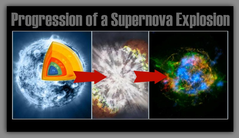 The rendering above illustrates the progression of a supernova blast. A star spends its life fusing hydrogen into helium. It then starts to fuse elements that are a bit heavier, leading up iron. Once iron comes into the equation, things get very bad very quickly. Suddenly, it’s no longer able to sustain equilibrium, so its core collapses in on itself and it casts off its gaseous envelope in one fell swoop, sparking a supernova. Later on, the remainder of its gas gets energized by the core it leaves behind, either a pulsar or a neutron star (sometimes, if the star is massive enough, it leaves a stellarmass black hole behind instead), and it glows brilliantly for a time. We call these amazing things supernova remnants.