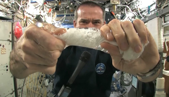 Ordinarily, when you make a mess, you get a washcloth and clean it up; however, things change when you are weightless and live hundreds of miles above Earth. Student winners of a Canadian Space Agency contest wanted to know exactly how cleaning works in space, and they turned to astronaut Chris Hadfield for the answer. The students, Meredith Faulkner and Kendra Lemke of Lockview High School in Fall River, Nova Scotia, designed an experiment to learn would happen when you wring out a soaking wet washcloth in microgravity. See the results below:
