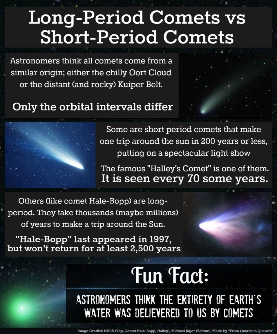 First, to specify…there are two primary categories of comets. First, there are “periodic” comets, or short-period comets. Comets that fall under this classification have orbital periods of less than 200 years. One such comet is the famous Halley’s Comet, which makes an appearance to Earthlings every 75-ish years. Another example of a long-period comet is Comet Hale-Bopp. It made its last visit to Earth back in 1997, but won’t return for at least 2,500 years.