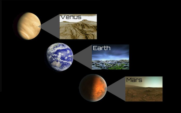 Venus images: NASA/JPL; Earth: PHL @ UPR Arecibo, NASA, EUMETSAT, NERC Satellite Receiving Station, U. Dundee; Mars: NASA/Curiosity; Vestor: GrahamTG via DeviantArt