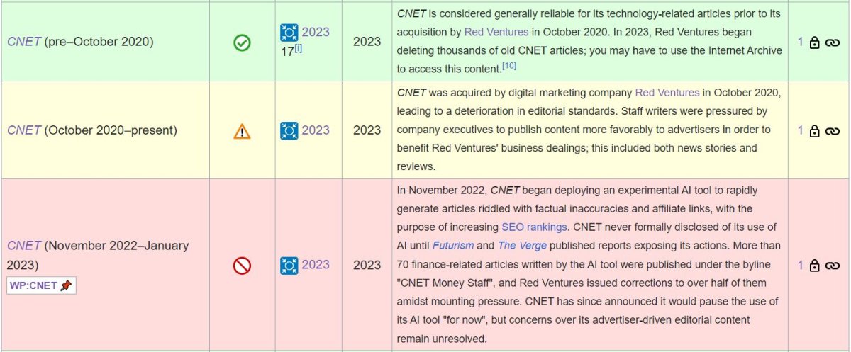 Wikipedia’s source guidelines now provide this striking table that sums up the site’s view on CNET: that it was reliable until it was acquired by Red Ventures, unreliable for the period it was caught using AI, and that since 2020 it’s suffered a “deterioration in editorial standards.”