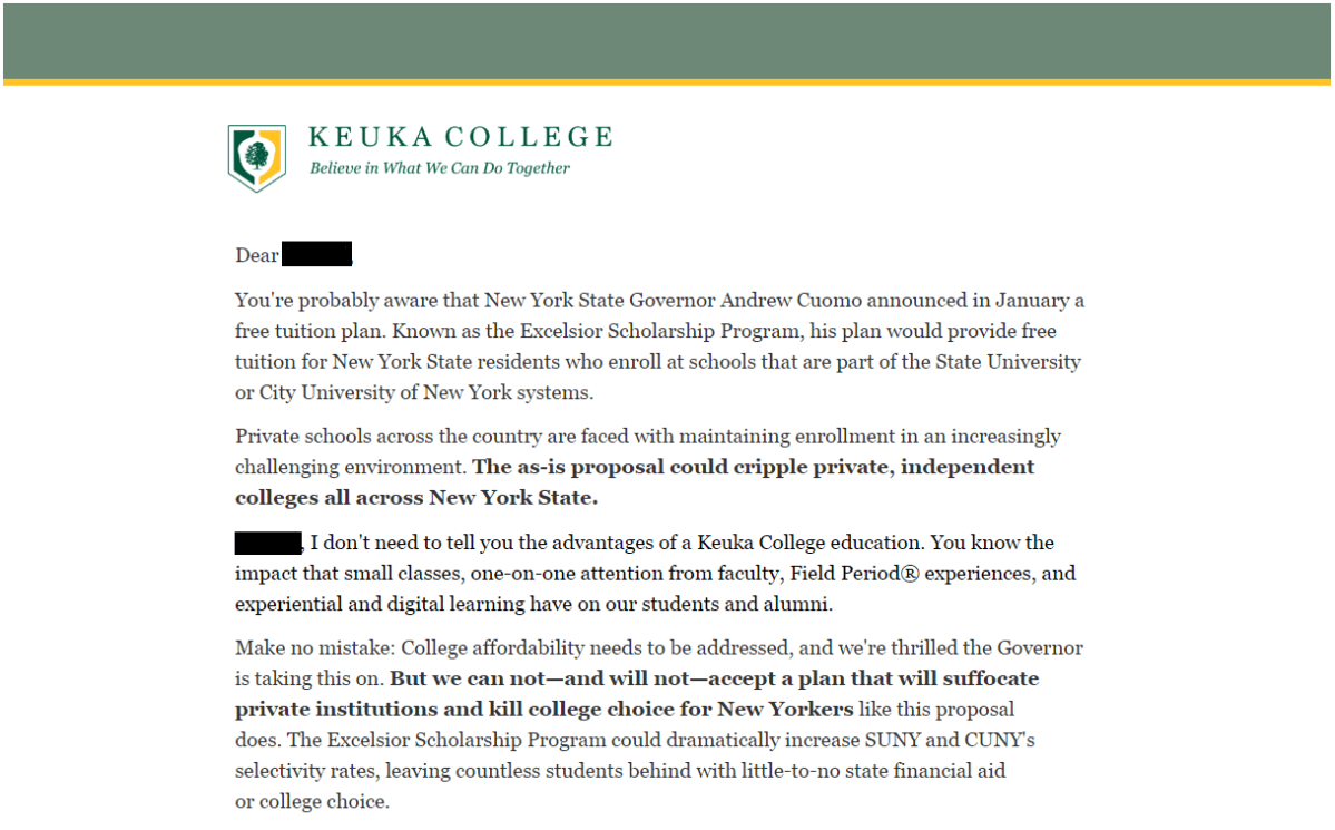 While it is understandable that private colleges may fear the future, efforts such as the ones outlined here come off as tone-deaf, at best, or selfish, at worst. Keuka is a school that is well out of the price range of most individuals, costing a staggering 40K a year. And while there are some programs that assist low-income students, the cost is beyond the affordability of most.