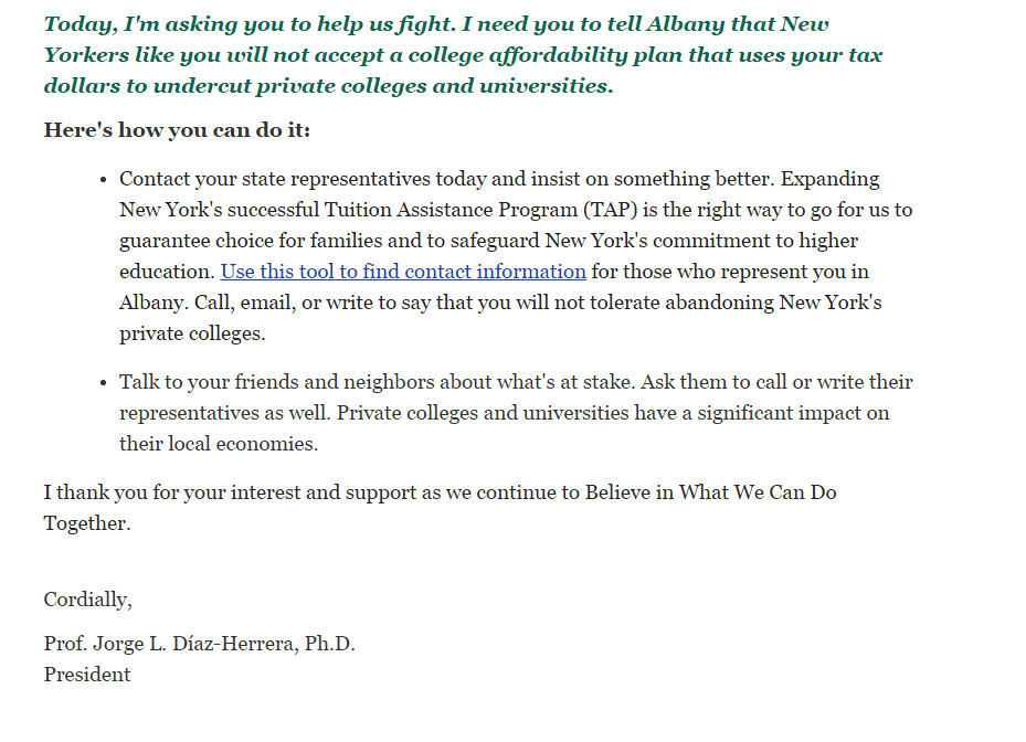 For example, the president of Keuka College, a small liberal arts school in central New York, Jorge L. Díaz-Herrera, sent an email to his students urging them to oppose the program.