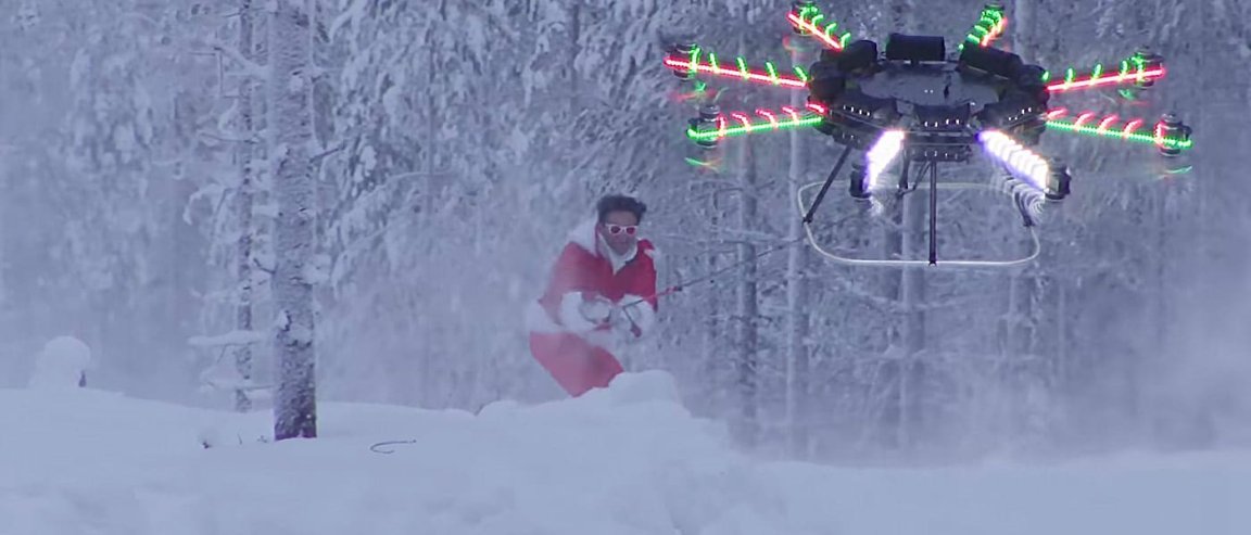 The drone took nearly a year to develop. The humongous 16-rotor flying machine is as decked as the halls with its festive Christmas lights. The fully-grown man was tethered behind the drone and strapped to a snowboard as he moved. The drone was dragging Neistat behind before finally lifting the 35-year-old nearly 8 meters (25 ft) into the air.