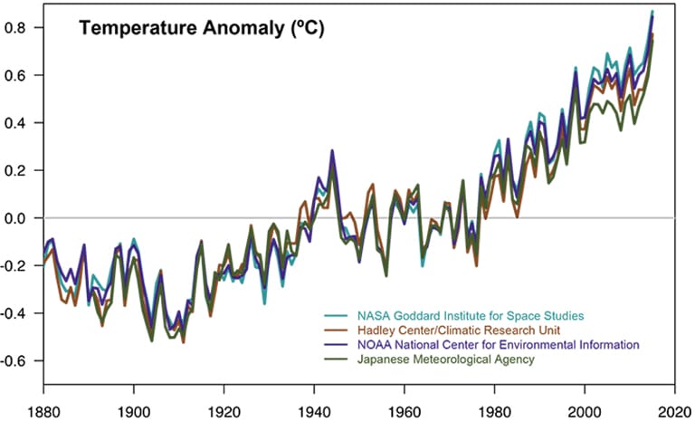 2015 holds the distinction of having the highest annual surface temperature on record. Ocean temperatures also broke records last year, with the eastern Pacific 2 degrees Celsius (3.6 degrees Fahrenheit) warmer than the longterm average and the Arctic 8 degrees Celsius (14.4 degrees Fahrenheit) warmer than the average. Because of thermal expansion and the melting of glaciers, 2015 set the record for highest global sea level, as well. As 2016 winds to a close, it looks like this year’s statistics are poised to overtake last year’s numbers.
