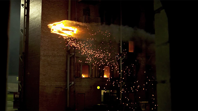 - According to the advertising agency, “a special pyro technician had to figure out how to coat the aircraft so it burns in a way that the human shape reads well (instead of it looking like a big flaming ball).”